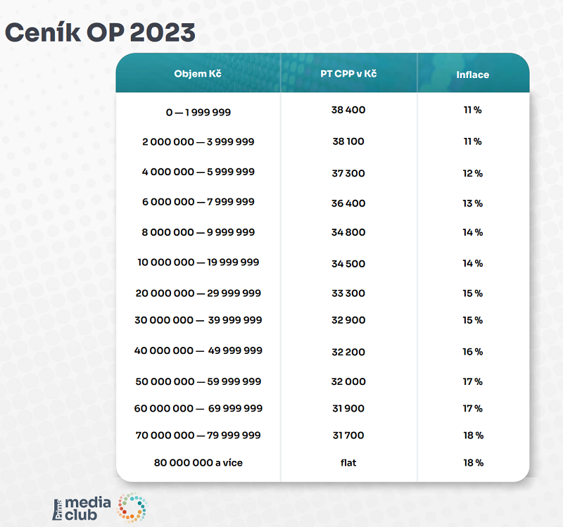 Mediální zastupitelství Media Club zvýší pro rok 2023 základní cenu reklamy CPP v průměru o 14 %. Nový ceník představil Media Club na středečním setkání s obchodními partnery. Nárůst cen je opět výraznější u klientů s vyššími rozpočty, kde v nejvyšších kategoriích dosahuje až 18 %. Naopak nejnižší míra inflace je na úrovni 11 %.