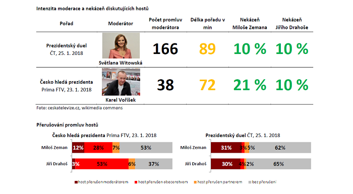 Přerušování hostů v diskusi veřejnoprávního média nejčastěji obstarávala aktivně moderující Světlana Witowská, která se doptávala a dožadovala zpřesnění vyslovených faktů. „Rozdíl v intenzitě a způsobu moderace obou pořadů byl značný. Zatímco Karel Voříšek v pořadu ‚Česko hledá prezidenta‘ nechával diskusi plynout a inklinoval k moderaci ve smyslu předávání slova, Světlana Witowská si vzala slovo více než čtyřikrát častěji,“ vysvětluje ředitel Media Tenoru Pavel Herot.