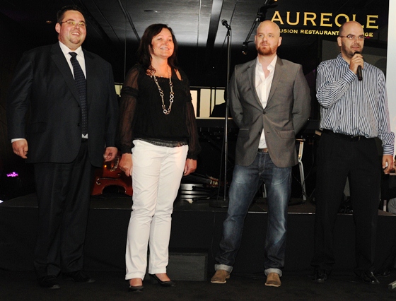 Čtveřice představitelů mediálních domů na party v prostoru restaurace Aureole. Zleva Jan Plamínek (ředitel společnosti R Media a ředitel inzerce vydavatelství Economia), Soňa Sitterová (obchodní ředitelka vydavatelství VLP), Karel Vágner (partner a obchodní ředitel Media Bohemia, jež je vlastníkem MMS), Michal Heisig (obchodní ředitel Seznam.cz).