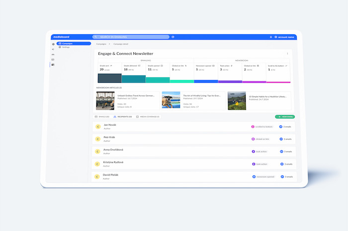Součástí nové služby je také pokročilá analytika a komplexní vyhodnocení kampaní. Monitoring médií umožňuje automatické přiřazování článků k tiskové zprávě vložené do newsroomu a trackování jejich výtěžnosti. Díky rozesílání e-mailů přímo přes platformu Mediaboard Connect může navíc uživatel analyzovat i reakce každého příjemce a zjistit, jestli si e-mail otevřel, jestli se proklikl na newsroom nebo například jak pracoval s dostupnými přílohami.