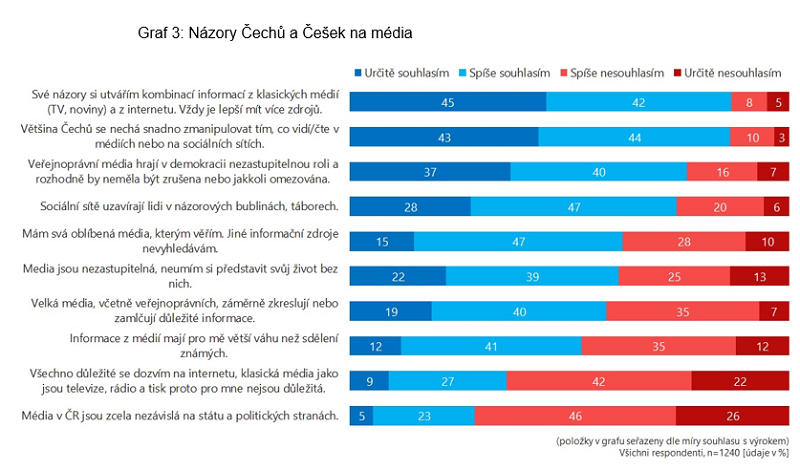 Většina médií (coby zdrojů informací) se těší u veřejnosti stále většinové důvěře (50 % a více). Výjimku tvoří sociální sítě (35 % důvěry) a řetězové e-mailové.