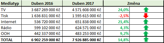 Objem monitorované televizní reklamy se v letošním dubnu zvýšil ve srovnání se stejným měsícem o rok dříve téměř o čtvrtinu. V korunovém vyjádření to představuje navýšení o necelých 900 mil. Kč, ukazuje monitoring reklamních investic společnosti Nielsen Admosphere. Podle monitoringu se dařilo i dalším mediatypům, pětinový nárůst si měla podle dat připsat internetová reklama. V případě internetové reklamy je ale sledována jen display reklama a video reklama. Celkově se měly investice do reklamního prostoru podle monitoringu v dubnu meziročně zvýšit o 15 %.