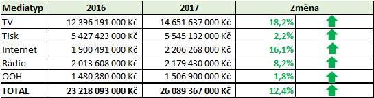Za první čtyři měsíce letošního roku má pak nárůst monitorovaných investic představovat více než 12 %, tedy o 2,8 mld. Kč. Opět nejvyšší nárůsty jsou registrovány v případě televizní reklamy a internetové reklamy. Monitoring ale nevyjadřuje reálné investice.