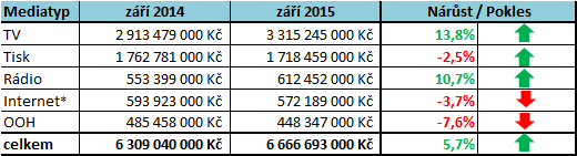 Za první tři letošní čtvrtletí celkový hrubý objem představuje téměř 48 mld. Kč, což je o 4 % víc než za období tří čtvrtletí v loňském roce. Opět nejvyšší nárůst se týká televizní reklamy (+11 %).