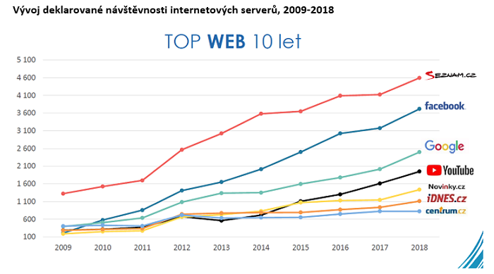 Stejného dlouholetého lídra má také internet – je jím Seznam.cz. Přestože čelí rostoucí konkurenci nadnárodních internetových médií, podle dat MML si vedoucí pozici udržuje. A to právě před Facebookem a Googlem.