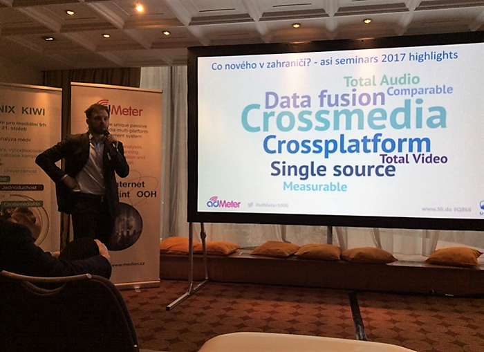 Josef Fišer, obchodní ředitel projektu adMeter agentury Median, na úvod představil zahraniční trendy. Zmínil, že crossmedialita je celosvětově stále diskutovanější téma. „Crossplatformní měření, fúze dat, data třetích stran, hybridizace. To jsou hlavní trendy, které v zahraničí zaznívají. Prosazuje se snaha popsat digitální svět pomocí metrik z televize a rádia. Mluví se o videu a audiu, ne o televizi a rádiích,“ uvedl.