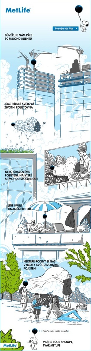 Hlavním hrdinou kampaně s názvem „Jsme nyní i tady…“ je známý pejsek Snoopy, maskot pojišťovny MetLife. „Chceme klientům ukázat, že MetLife, která patří mezi největší pojišťovací společnosti na světě, působí nyní i na českém trhu. Jsme tu s přátelskou tváří v podobě pejska Snoopyho pro všechny klienty v dosahu a životní i úrazové pojištění za našimi klienty stojí ve všech situacích,“ říká Eva Drábová, Branding&Advertising Executive společnosti MetLife.