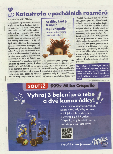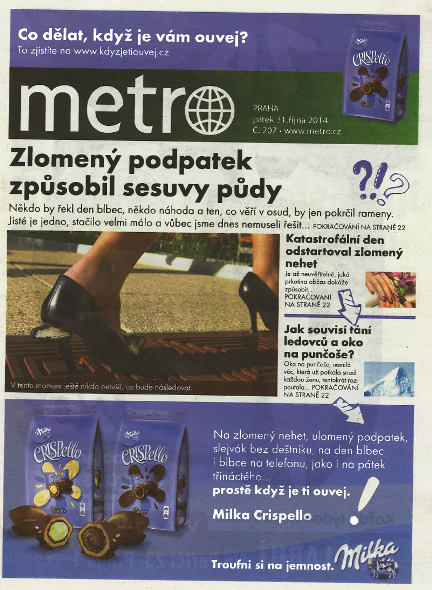 Milka podpořila svou cukrovinku Crispello, spojující čokoládu a pudink, pátečním přebalem deníku Metro. Promotéři v barvách značky se v pátek rovněž postarali o kamelotáž gratis deníku v prostorách pražského metra. Ke každému výtisku dostali cestující i sampling.
