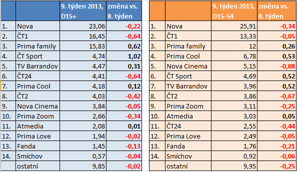 Kanály Prima family, ČT Sport a TV Barrandov si v minulém týdnu (od 25.2. do 3.3. 2013) ve srovnání s předcházejícím týdnem nejvíce polepšily mezi diváky staršími 15 let. V mladší skupině 15-54 se k nim přidala ještě Prima Cool, která nově potvrzuje pozici čtvrté nejsledovanější televize u mladších diváků.