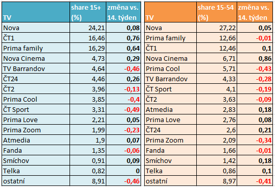 ČT1 a Prima family si v 15. letošním týdnu (týden od 8. 4. do 14. 4.) polepšily v podílech na sledovanosti ve skupině diváků starších 15 let nejvíce ze všech stanic v porovnání s předešlým 14. týdnem. Podíl ČT1 se zvýšil o 0,8 procentního bodu, Prima family o 0,6 procentního bodu.