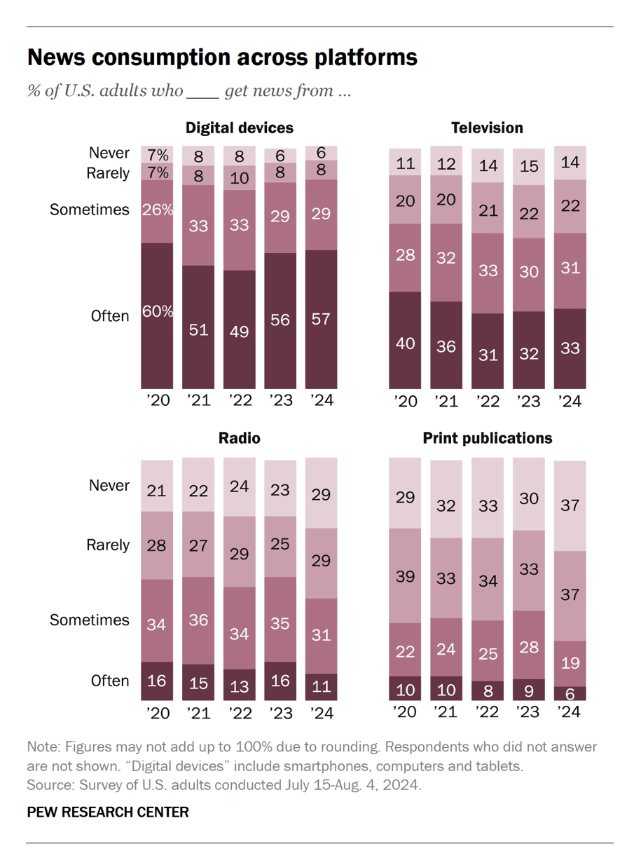 Až 86 % dospělých alespoň někdy konzumuje zpravodajství online, a to prostřednictvím chytrého telefonu, počítače nebo tabletu. Více než polovina (57 %) tak činí často. Ve srovnání s tím v televizi sleduje zprávy alespoň někdy 63 % dotázaných a často jen třetina (33 %).