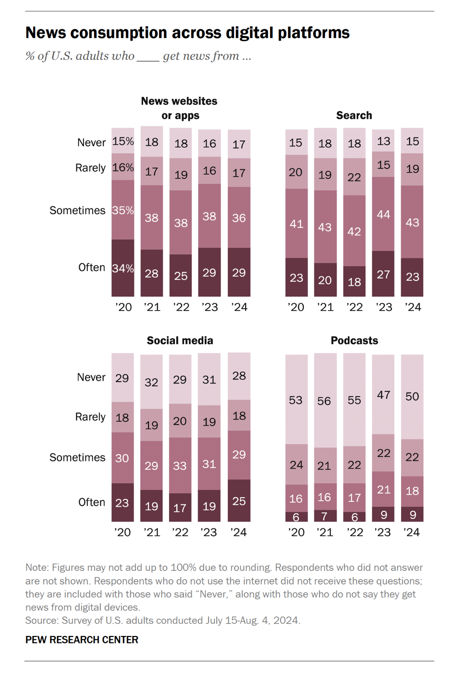 Ze sociálních sítích vede z pohledu konzumace zpravodajství Facebook a YouTube, které pravidelně využívá třetina dotázaných. Zprávy na Instagramu sleduje 20 % respondentů, na TikToku 17 % a na X (dříve Twitter) 12 %. Mezi menší „zpravodajské” hráče patří ještě Reddit (8 %), Nextdoor (5 %), Snapchat (5 %), WhatsApp (5 %), LinkedIn (4 %), Truth Social (3 %) a Rumble (2 %).