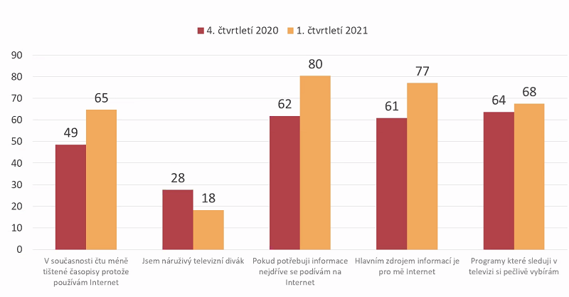 Data MML rovněž ukázala, v případě mediálního chování pandemie posílala postavení internetu, který podle výzkumu označilo 77 % lidí za hlavní zdroj informací a 80 % uvedlo, že pokud potřebují informace, podívají se na internet.