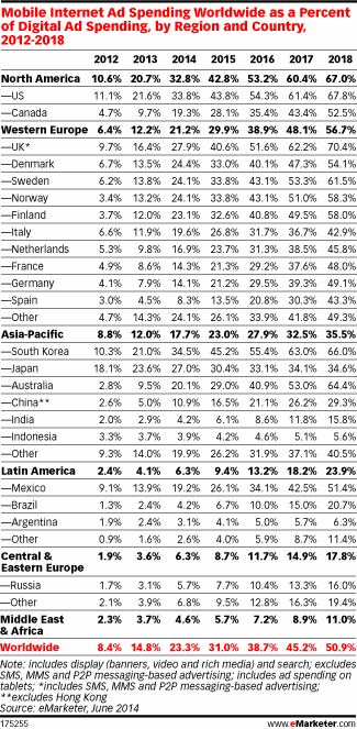 Podle serveru eMarketer by se měly investice do mobilního marketingu do roku 2018 více než zdvojnásobit. V západní Evropě by měl jejich podíl z celkového digitálního rozpočtu dosáhnout 56,7 %, v našem regionu 17,8 %. Jedním z důvodů je i dvojnásobný CTR, který mobilní reklama ve srovnání s reklamou na desktopu vykazuje.
