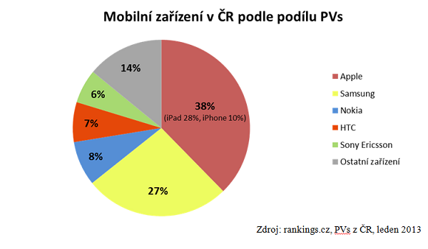 Pokud jde o využívanost jednotlivých mobilních zařízení nebo operačních systémů k on-line aktivitám, základní přehled je dostupný na stránce rankings.cz. Ta zprostředkovává údaje za všechna média měřená systémem gemiusAudience, který je využíván i pro NetMonitor. Nejvíce přístupů na webstránky podle PVs je v Česku vykonáno z mobilních zařízení značky Apple, a sice 28 % z tabletu iPad a 10 % z telefonu iPhone. Podíl v posledních letech významně posílil Samsung na lednových 27 %. Výrobci Nokia, HTC a Sony Ericsson mají podobný podíl na shlédnutých stránkách, 6-8 %.
