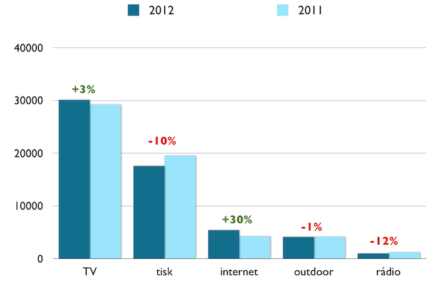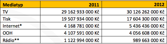 Nejprogresivnějším mediatypem byl i v roce 2012 internet, ceníková hodnota využité display reklamy (internet je monitorován v rozsahu projektu AdMonitoring) vzrostla oproti předchozímu roku téměř o třetinu na 5,4 miliard korun. O 3 % vzrostla i souhrnná ceníková hodnota televize, která je z pohledu monitoringu ceníkových hodnot mediatypem nejsilnějším. Celkově zadavatelé v uplynulém roce využili televizní komerci v hodnotě 30 miliard korun.