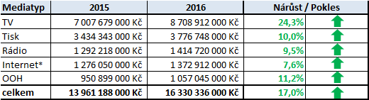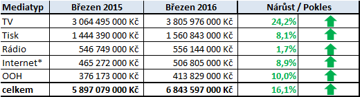 Za období prvního letošního čtvrtletí měly nejvýrazněji růst výdaje na televizní reklamu, a to meziročně o 24 %, což představuje zvýšení o 1,7 mld. Kč. Polepšit si ale podle monitoringu měly všechny mediatypy, jak ukazuje následující srovnání.