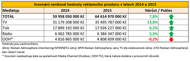 Podle monitoringu reklamy AIS společnosti Nielsen Admosphere vykázal reklamní trh v roce 2015 téměř 8% růst oproti předchozímu roku. Nejvíce se na něm podílela televize, u níž zadavatelé využili reklamní prostor v hodnotě 35,5 miliardy korun. Navýšení je patrné i u rozhlasu. Tisk, stejně jako out-of-home média, v uplynulém roce stagnoval.