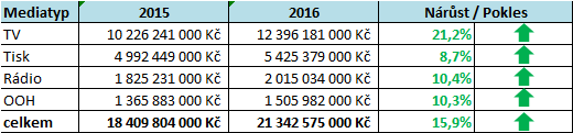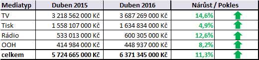 Celkový objem investic směřovaných do televizní reklamy by měl být v letošním roce (za období leden-duben 2016) vyšší o 2 mld. Kč (+15 %) ve srovnání se stejným obdobím před rokem. Jde ale jen o hrubé investice. O více než 400 mil. Kč si měla podle monitoringu polepšit v letošním roce i tištěná média.