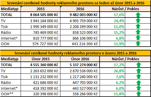 Také pro druhý letošní měsíc přináší monitoring mediálních investic optimistické údaje o vývoji v roce 2016. Potvrzuje tak příznivý trend, který monitoring přisuzoval i lednovým investicím. Podle monitoringu společnosti Nielsen Admosphere se hrubé investice do nákupu reklamního prostoru v médiích v letošním únoru meziročně zvýšily o 17 % (dolní tabulka). Nejvyšší navýšení spatřuje monitoring v případě televizní reklamy (+27 %), polepšit si ale měly všechny sledované mediatypy. Celkový výsledek za první dva letošní měsíce je dokonce podle monitoringu +18 % (horní tabulka).