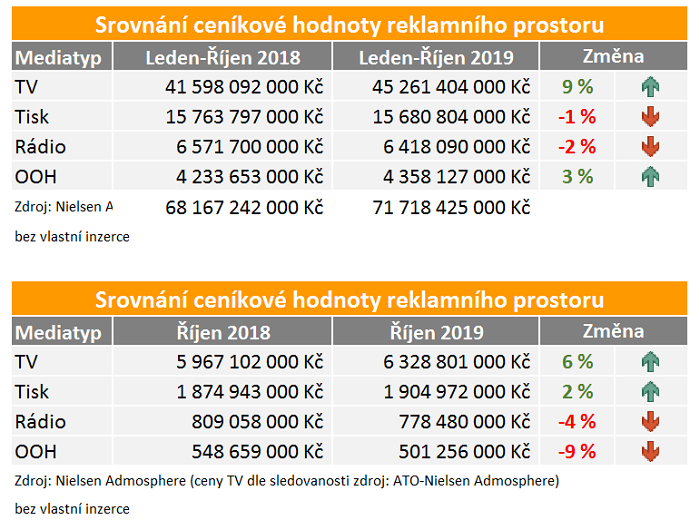 Za prvních deset měsíců letošního roku je monitorovaný hrubý objem reklamních investic také nad úrovní období leden až říjen 2018.