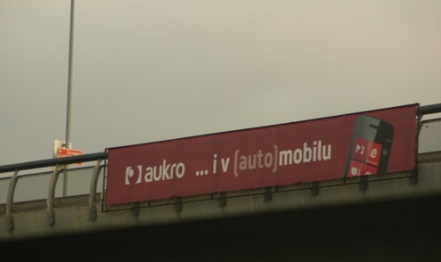 Dálniční mosty využívá pro reklamu i obchodní portál Aukro, který touto cestou propaguje své mobilní aplikace. V kampani, jež vznikla in-house, jsou využívány slogany, jež si hrají se slovem (auto)mobil.
