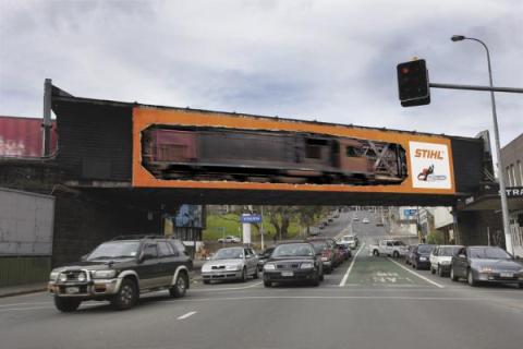 V zahraničí však dokáží z mostů vytěžit mnohem víc. Například novozélandská agentura DDB umístila reklamu na motorové pily značky Stihl na železniční most.