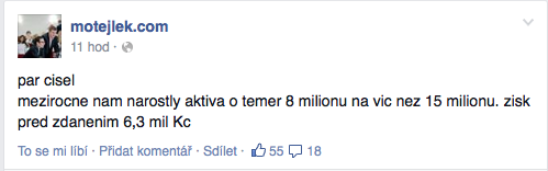 Zisk před zdaněním společnosti Motejlek.com, která provozuje stejnojmenný byznysový web, se loni zvýšil na 6,3 mil. Kč, napsal na sociální síť majitel společnosti Miroslav Motejlek. V roce 2012 představoval zisk před zdaněním 2,8 mil. Kč. Aktiva firmy se v loňském roce zvýšila na více než 15 mil. Kč. V roce 2012 představovala 7,4 mil. Kč.