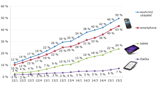Nejrozšířenější jsou chytré mobilní telefony, které podle Media projektu už vlastní 43 % populace. Tablety má mít podle výzkumu téměř čtvrtina populace (24 %) a čtečky elektronických knih asi 7 %. Zajímavý je i pohled na sociodemografii uživatelů, kteří elektronická zařízení využívají. Nad průměrem celkové populace jsou především skupiny mladých uživatelů ve věku 12-39 let, lidé s vysokoškolským vzděláním a obyvatelé hlavního města. Za rok se také zvýšil počet vlastněných zařízení jednotlivcem. Zatímco dvě zařízení mělo loni v pololetí jen 10 % populace, v letošním pololetí už to bylo 16 % populace.