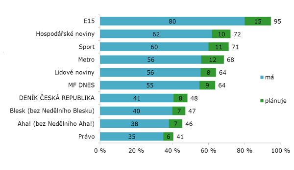 Nejvíce jsou elektronická zařízení rozšířená mezi čtenáři ekonomických deníků – E15, kde je podle ve výzkumu vlastní 80 % čtenářů, a Hospodářských novin, kde je to cca 62 % čtenářů. Naopak nejméně rozšířené jsou elektronická zařízení u čtenářů deníku Právo.