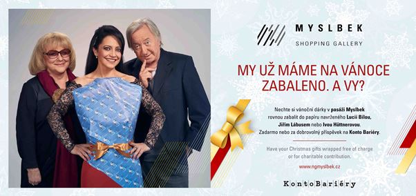 Nákupní galerie Myslbek spouští vánoční kampaň s podtitulem „My už máme na Vánoce zabaleno. A vy?. Jejími tvářemi se stala Lucie Bílá, Iva Hüttnerová nebo Jiří Lábus, kteří navrhli vlastní balicí papíry, do nichž si zákazníci Myslbeku mohou nechat od 27. listopadu do Štědrého dne zabalit své dárky zadarmo nebo za dobrovolný příspěvek Kontu Bariéry na pomoc lidem s handicapem.