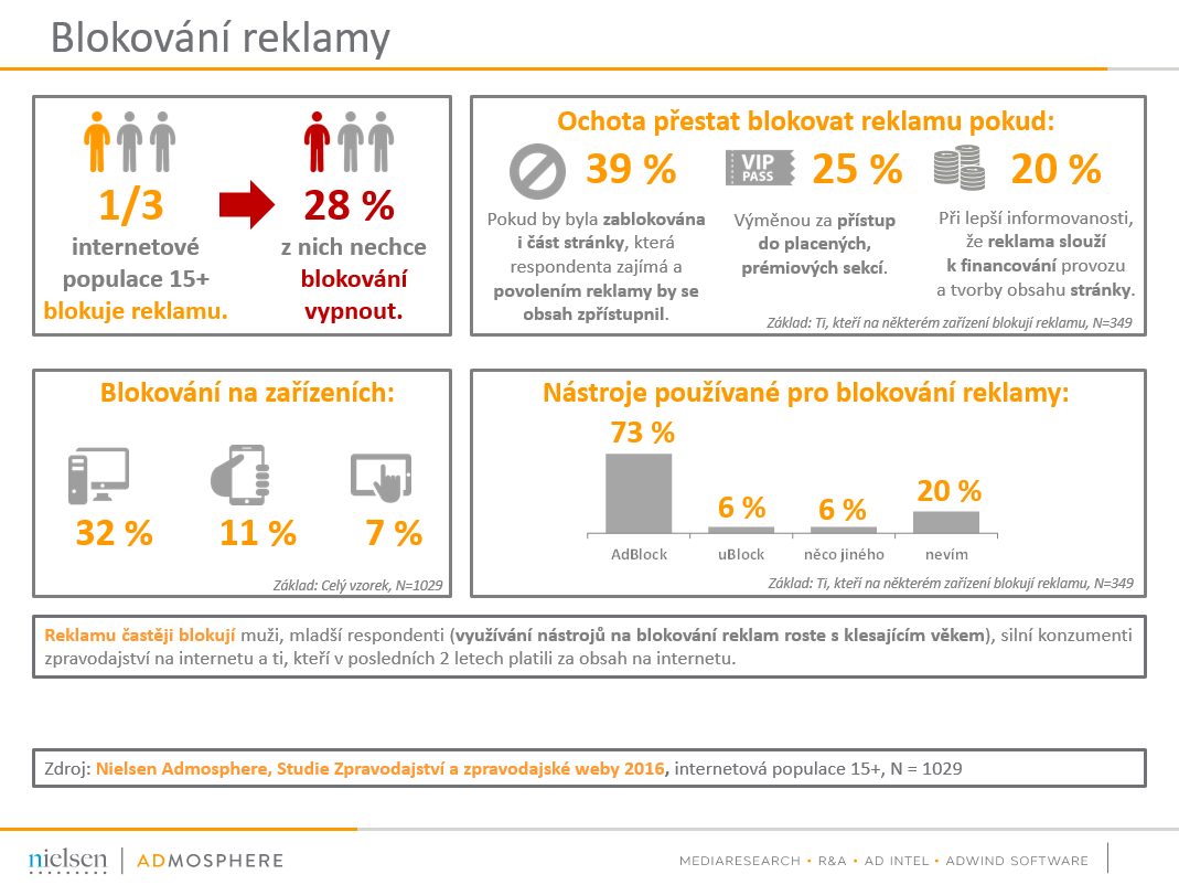 Internetovou reklamu blokuje až třetina české internetové populace starší 15 let. Vyplývá to ze Studie o zpravodajství a zpravodajských webech agentury Nielsen Admosphere.