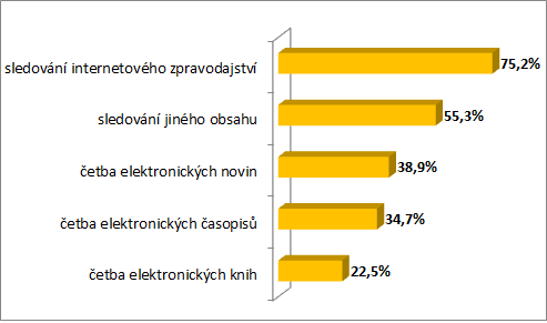 Sledování internetového zpravodajství uvádí jako nejčastější aktivitu pro čtení na elektronických zařízeních většina respondentů. Z výzkumu Media projekt, který poprvé zkoumal i penetraci elektronických médií v Česku a jejich využití pro konzumaci obsahů, vyplynulo, že 75 % respondentů uvedlo jako hlavní obsah, který na čtečkách sledují, právě internetové zpravodajství. K četbě elektronických novin a elektronických časopisů se přihlásilo 38,9 %, resp. 34,7 % respondentů.