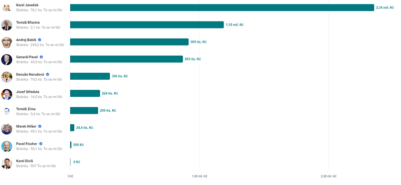 Následující přehled o reklamních výdajích kandidátů nepokrývá pouze Instagram, ale všechny platformy společnosti Meta, tedy primárně zmiňovaný Instagram a také Facebook. Od 13. srpna do 10. listopadu 2022 nejvíce peněz do reklamy na Facebooku a Instagramu nasypal Karel Janeček (2,34 milionu Kč) a pak také Tomáš Březina (1,18 milionu Kč) a Andrej Babiš (0,9 milionu Kč).