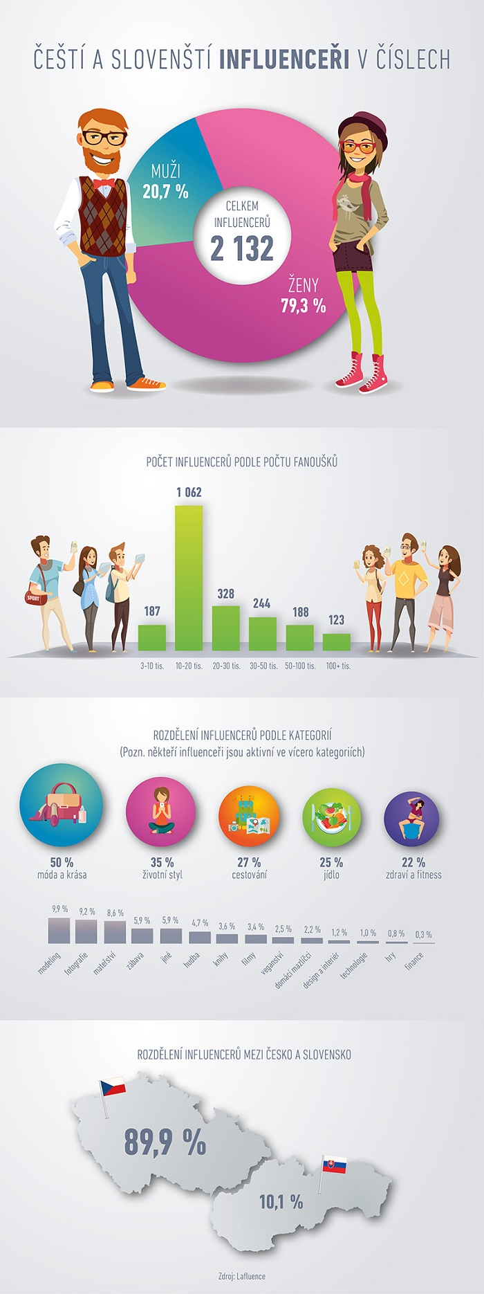 Podle platformy Lafluence se v Česku a na Slovensku pohybuje přes 2100 influencerů. Bezmála 90 % z nich působí v Česku a v naprosté většině jsou to ženy. Nejčastěji se zaměřují na módu a krásu.