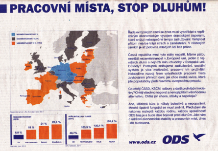 Od soboty 21. dubna začala ODS uveřejňovat sérii tiskových inzerátů, které signalizují hlavní priority ODS - zastavit zadlužování a podpořit pracovní místa.To celé zasazené do aktuálního evropského kontextu. Inzertní kampaň pracuje také s méně známými informacemi o nezaměstnanosti a veřejném dluhu v zemích EU. Na kampani spolupracuje agentura Konektor.