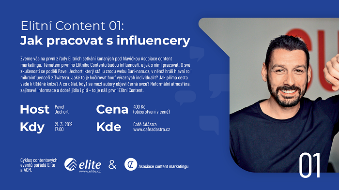 Asociace content marketingu se svou členskou agenturou Elite solutions startuje sérii setkání Elitní content. První z nich se bude konat 21. března od 17 hodin v Café Adastra. Na téma „Jak pracovat s influencery“ na něm vystoupí Pavel Jechort, který stal u zrodu webu Suri-nam.cz v němž hráli hlavní roli mikroinfluenceři z Twitteru.