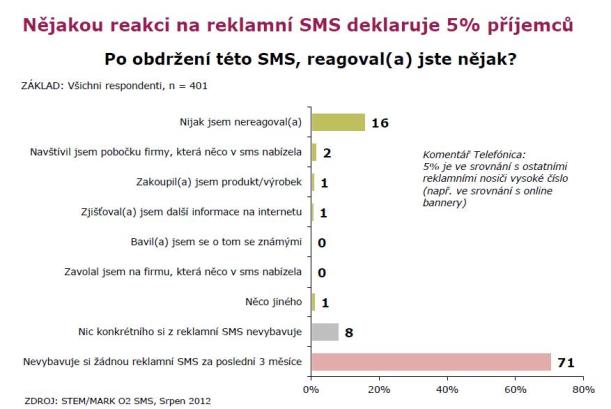 Až 27 % respondentů téže skupiny považovalo zaslanou SMS za relevantní Po obdržení SMS 2 % všech respondentů navštívila pobočku firmy, která v reklamním sdělení něco nabízela, 1 % si následně zjišťovalo další informace na internetu a 1 % si nabízený produkt zakoupilo.