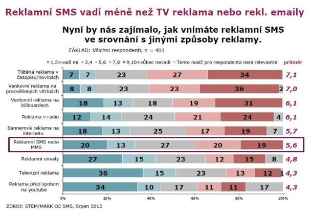 V porovnání s jinými reklamními formáty vadí SMS reklama méně než například televizní, e-mailová či YouTube reklama.