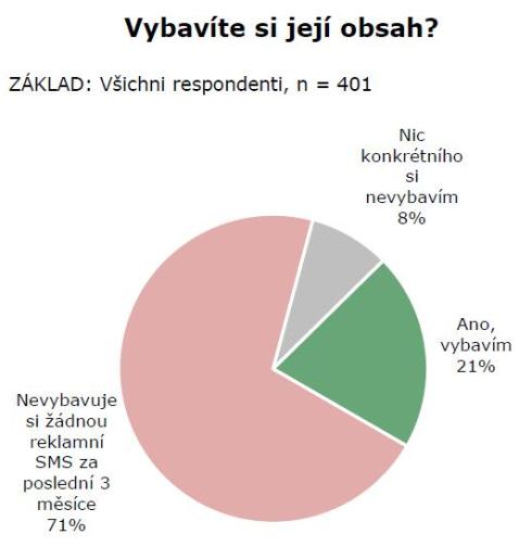 Povědomí o doručení reklamních SMS v posledních třech měsících je zhruba třetinové: 29 % všech respondentů si vybavuje reklamní SMS, která jim přišla na jakékoliv téma mimo služby operátora, přičemž 21 % respondentů si pamatuje i její obsah.