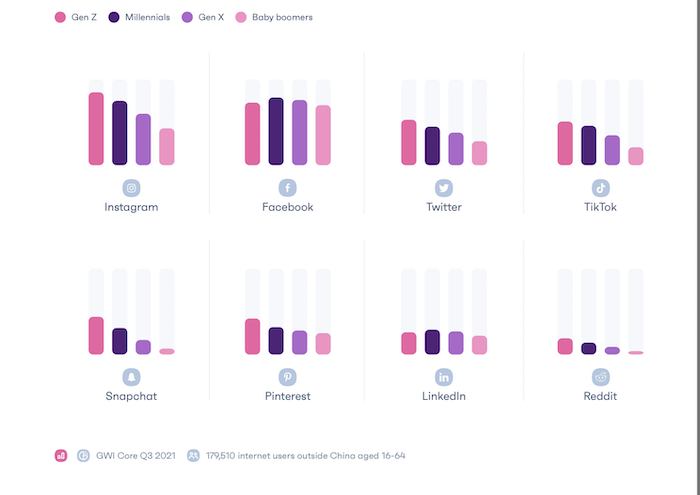 Dál roste také oblíbenost Tik Toku. Od roku 2020 vzrostl počet uživatelů, kteří ho měsíčně používají o 32 %. Největší nárůst pochází z generace X (narození mezi 1965-1980) a baby boomers (narození po 2. sv. válce mezi roky 1946-1964). Aktivity na sociálních sítích se liší napříč kontinenty. Uživatelé v Asii a Tichomoří používají platformy hlavně kvůli sledování živých přenosů. V Latinské Americe sítě využívají k hledání věcí ke koupi, zatímco v Severní Americe je nejvýraznějším důvodem pro přihlášení udržování kontaktu s přáteli a rodinou. Podle výzkumu však v roce 2021 nastala změna a lidé se na platformy čím dál častěji přihlašovali kvůli komerčním aktivitám.