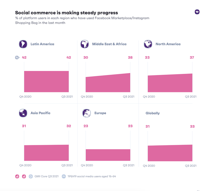 Nakupování přes sociální sítě má různý stupeň obliby napříč kontinenty. I přesto se ale celosvětově obchod přes sociální sítě rozšiřuje. Od roku 2020 se podle výzkumu nakupování přes sítě zvýšilo o 8 %.
