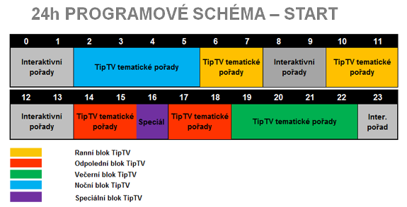 Program TipTV je složen z deseti tematických celků pro jednotlivé cílové skupin. Například pořad Aktivní život je určen pro seniory, Just NoW naopak pro mladé, na muže cílí Já, Muž!, na ženy zase Být šik!. V bloku „Start-Up“ bude představována nabídka vzdělávacích a personálních agentur či workshopy pro začínající podnikatele. Pořad „Automototip“ nahlédne do autosalónů či společností na leasing, pojištění, asistenci apod.