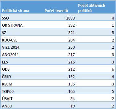 Při pohledu na statistiku stranických účtů lze v prvé řadě konstatovat, že Twitter jako platformu pro volební komunikaci využila méně než polovina (16) z celkového počtu 38 stran, které se voleb zúčastnily. Z parlamentních stran chybí pouze stranický účet ANO 2011, což poněkud kontrastuje s faktem, že účet stranického lídra Andreje Babiše patří s více než 26 tisíci následovníky mezi nejvíce sledované účty na českém Twitteru. Sám Babiš nicméně v průběhu kampaně publikoval pouze 23 tweetů.