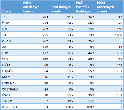 Stranické účty jsou do počtu odeslaných tweetů na prvních čtyřech místech velmi vyrovnané: Strana zelených (283), ČSSD (273), LES (269) a SSO (255). Poměr „síťových tweetů“ je nejvyšší u Strany zelených (91 %), absenci vykazují účty Věcí veřejných, KSČM, Koruny České a Občanské konzervativní strany. Není-li do analýzy zahrnuta strana Republika, která sice tweetovala pokaždé s hashtagem, ale celkově publikovala jen tři tweety, lze říci, že relativně nejčastěji používala hashtagy v komunikaci na stranickém Twitteru ČSSD (66 %).