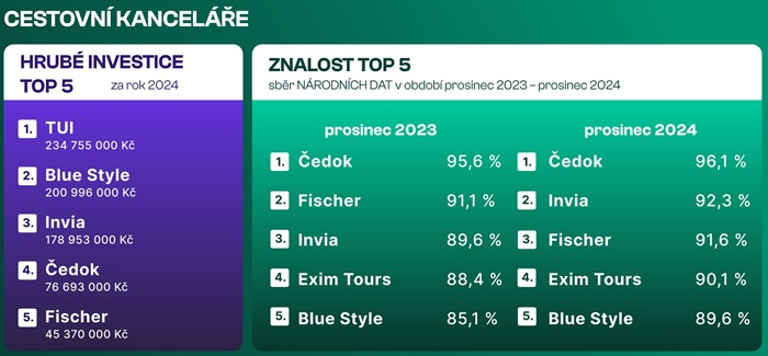 V segmentu cestovních kanceláří (CK) v roce 2024 nejvíce inzerovala značka TUI, která na český trh vstoupila v létě 2023 a těmito výdaji se snaží o vybudování silnější pozice v povědomí české populace. Napovídají tomu její celkové roční investice do reklamy v ceníkových cenách ve výši přes 234 milionů Kč. Na druhém místě se podle výše investic nachází cestovní kancelář Blue Style a na třetím pak v těsném závěsu Invia.