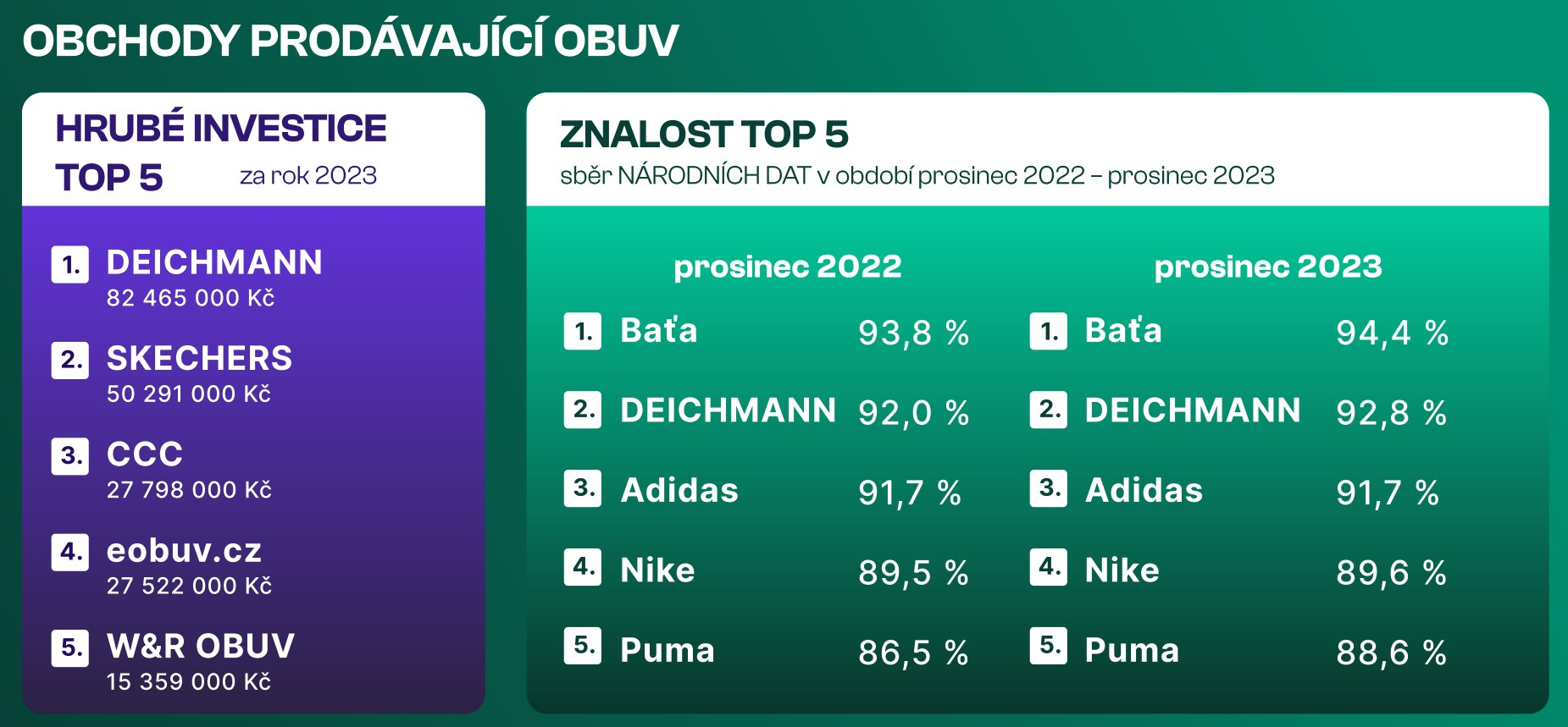 „Lze konstatovat, že Baťa svou vysokou znalost drží i díky pozici tradiční značky výrobce a prodejce obuvi, kterou v Česku historicky je. Značky, které doplňují první pětici, tedy Adidas, Nike a Puma, pak podle všeho těží z dlouhodobě silné mezinárodní vizibility svých značek i z provázanosti s profesionálním sportem,“ doplňuje Martin Chalupník z NADA Research. I přes nižší výdaje na reklamní komunikaci v kategorii prodejců obuvi tak obsadily třetí až páté místo ve znalosti značky. Naopak CCC, eobuv.cz a W&R Obuv, tedy značky, které se umístily dle hrubých investic na třetím až pátém místě, se do žebříčku nejznámějších pěti značek nevešly.