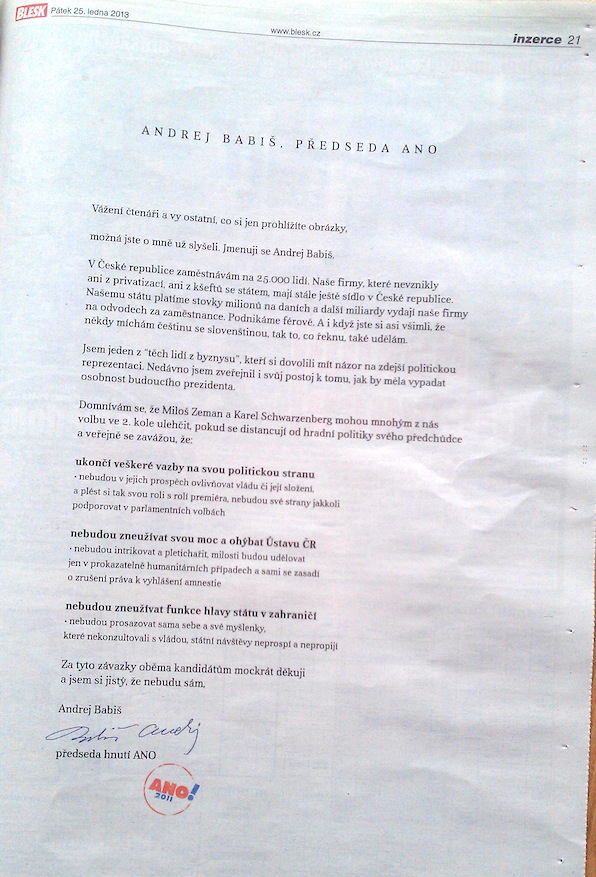 Prezidentské volby využil ke komunikaci také Andrej Babiš, předseda hnutí Ano 2011. V celostránkovém inzerátu v deníku Blesk vyjmenovává, co požaduje od prezidenta republiky, aniž by se vyjádřil pro jednoho z kandidátů.