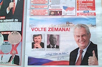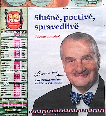 Nejhrubší inzerát, který ovšem není podepsaný, se objevuje v bulvárním deníku Blesk, který pod sloganem „Nevolte Karla Schwarzenberga” vyjmenovává důvody, proč ministra zahraničí nevolit. Argumenty jsou však za hranou slušného politického soupeření. Jedním z argumentů proti Schwarzenbergovi má být mj. to, že za podporu děkuje představiteli Sudetendeutsche Landsmannschaftu Berndu Posseltovi. Jak upozorňuje server Česká pozice, u tohoto inzertního sdělení chybí označení zadavatele (Zeman se k němu nehlásí), čímž se do problémů dostává i vydavatel deníku Ringier Axel Springer CZ, protože, jak píše server, jedná protizákonně. Zákon stanoví, že propagace nebo volební agitace šířené prostřednictvím komunikačních médií musí obsahovat informaci o jejich zadavateli a zpracovateli, dodává ČTK.