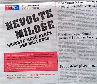 S útočným inzerátem přicházejí i strany TOP 09 a Starostové a nezávislí, které Schwarzenberga na prezidentský úřad podporují. S výzvou „Nevolte Miloše, nevolte méně peněz pro vaši obec” přesvědčují voliče k tomu, aby k urnám přišli a zvolili si prezidenta, který „jejich obec neokrade o peníze”. Inzerát se objevil v denících Blesk a Právo.